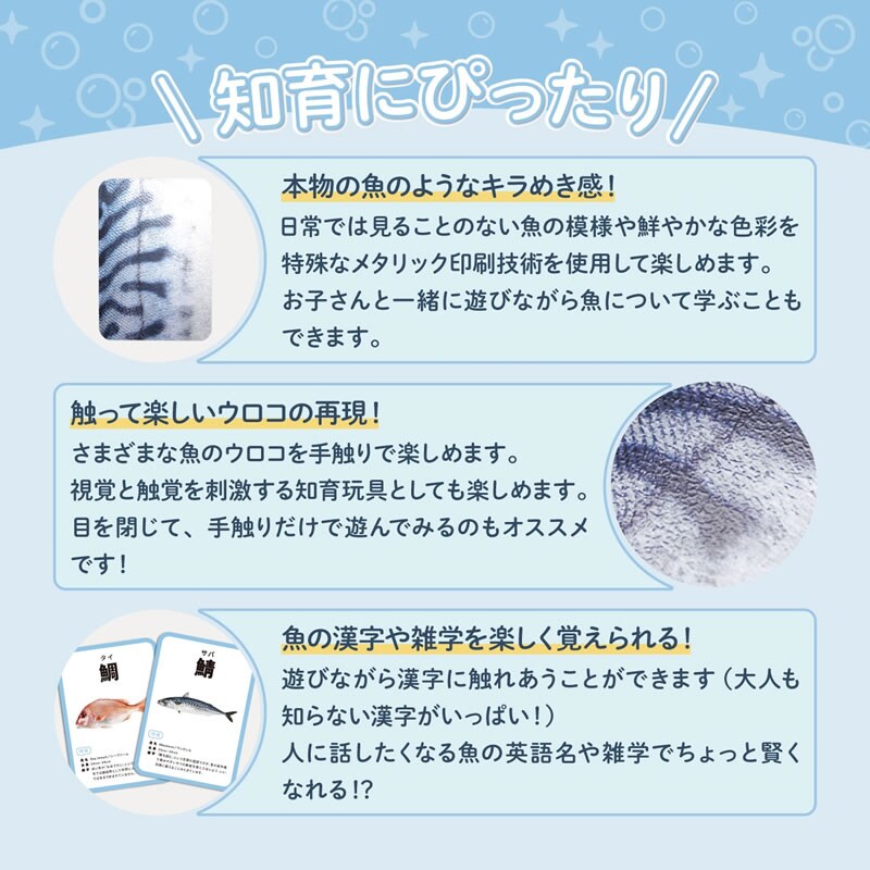 視力が悪いお年寄りや小さなお子さまなどルール次第で皆で遊べて、魚の漢字や雑学を学ぶこともできます。