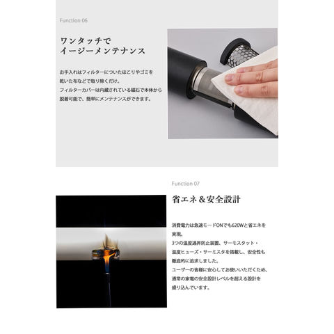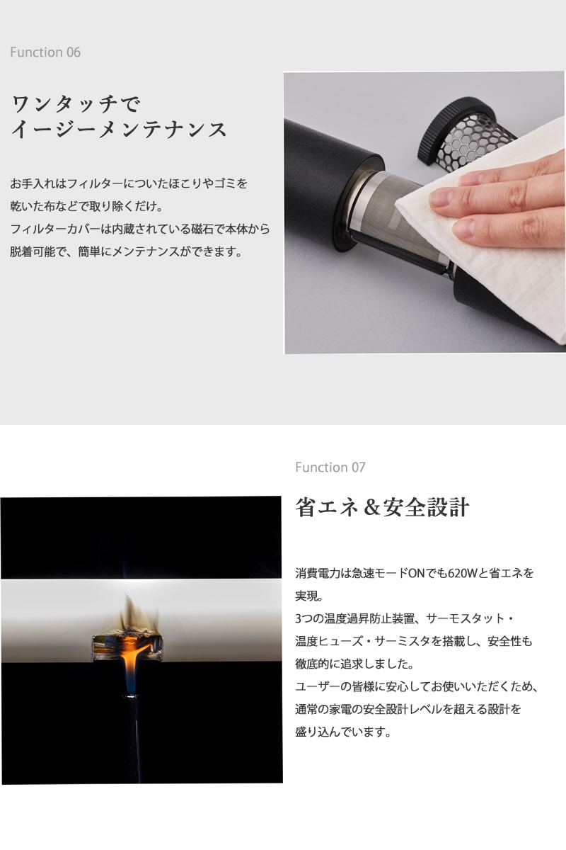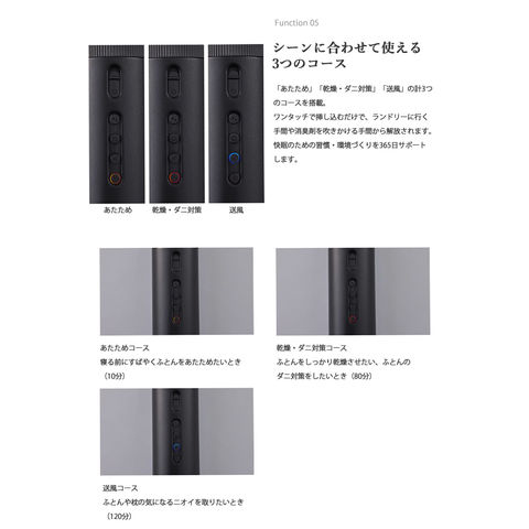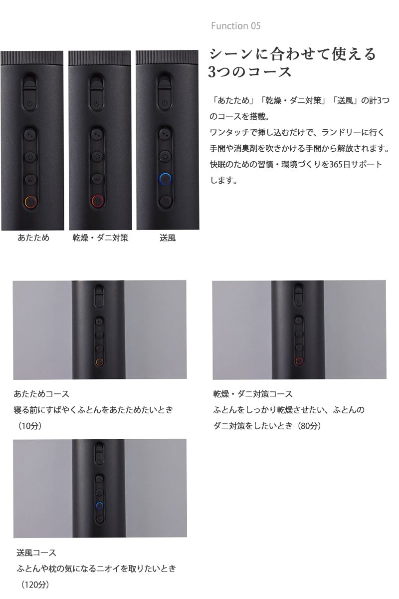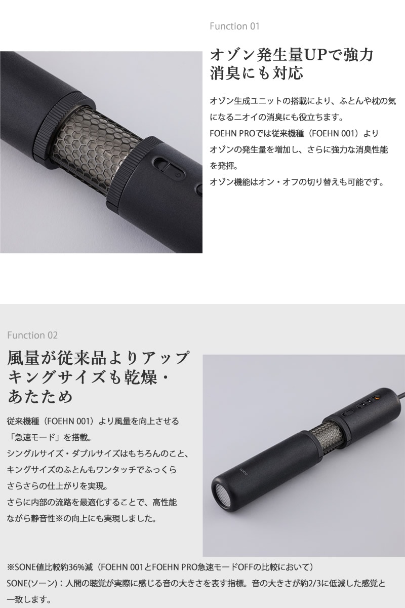 従来機種(FOEHN 001)より風量を向上させる「急速モード」を搭載。 シングルサイズ・ダブルサイズはもちろんのこと、キングサイズのふとんもワンタッチでふっくらさらさらの仕上がりを実現。