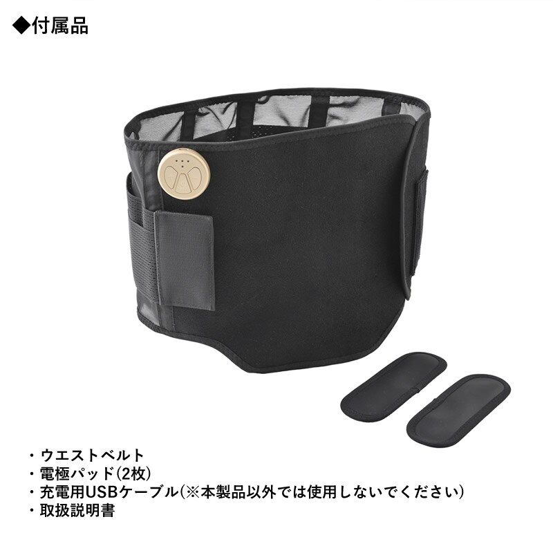 本体、ウエストベルト 1枚、電極パッド 2枚、充電用USBケーブル 1個、取扱説明書(保証書付)