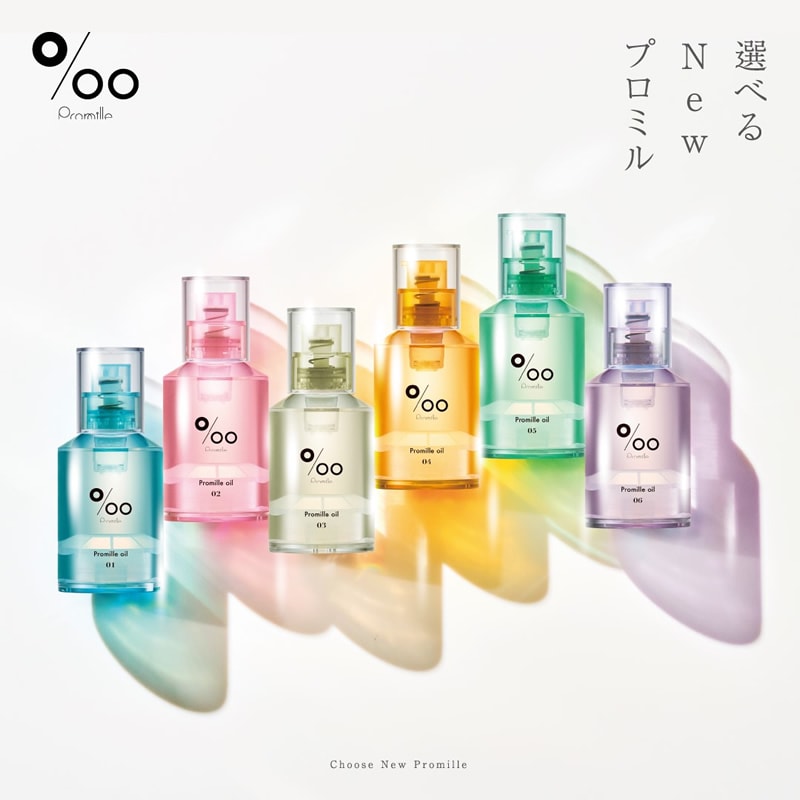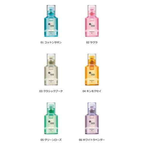 既存の「プロミルオイル」シリーズで多くのお客様からご好評いただいた「クラシックブーケ」、「キンモクセイ」の香りに「コットンサボン」、「サクラ」、「グリーンローズ」、「ホワイト ラベンダー」の香りが新たに加わった6種の展開。