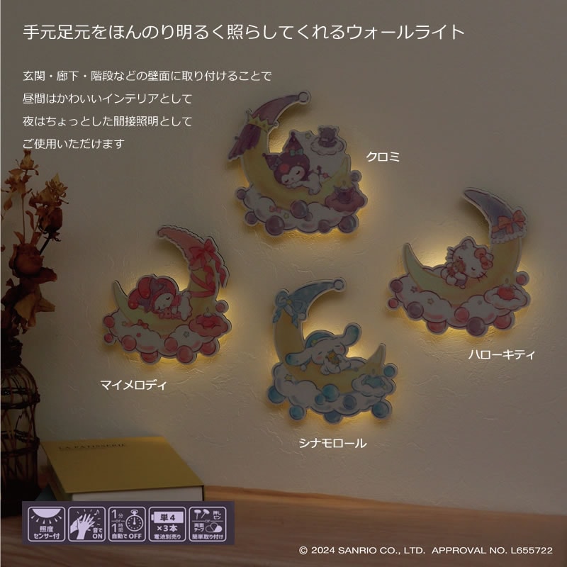 サンリオキャラクターズ ウォールライト ウォールライト 壁掛け 電池式 音感センサー 照度センサー ステッカー 可愛い ハローキティ マイメロディ クロミ シナモロール