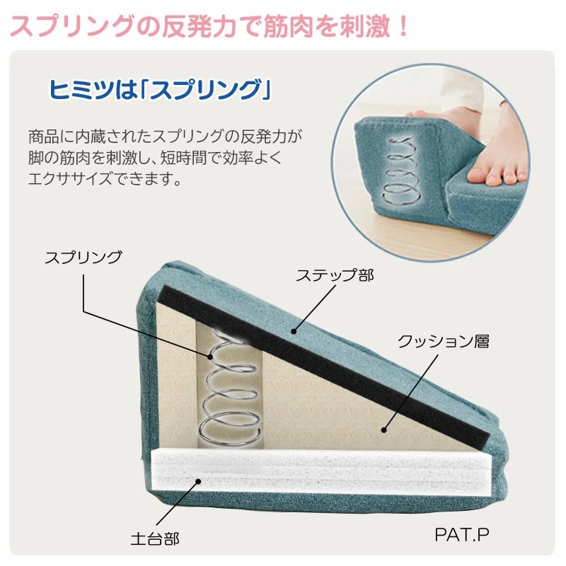 商品に内蔵されたスプリングの反発力が脚の筋肉を刺激し、短時間で効率よくエクササイズできます。