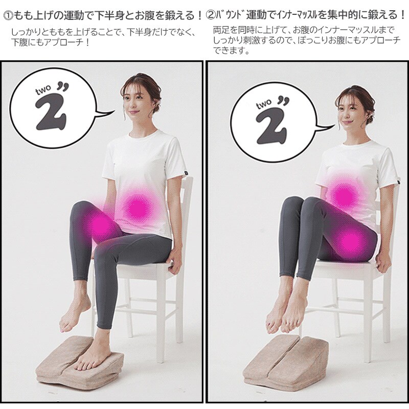 (2)バウンド運動でインナーマッスルを集中的に鍛える!両足を同時に上げて、お腹のインナーマッスルまでしっかり刺激するので、ぽっこりお腹にもアプローチできます。