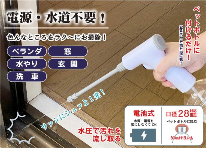 掃除 洗車 ベランダ サッシ 窓 網戸 水やり ガーデニング 電池式 乾電池式 簡単 便利 霧吹き ミスト 玄関 ペットボトル
