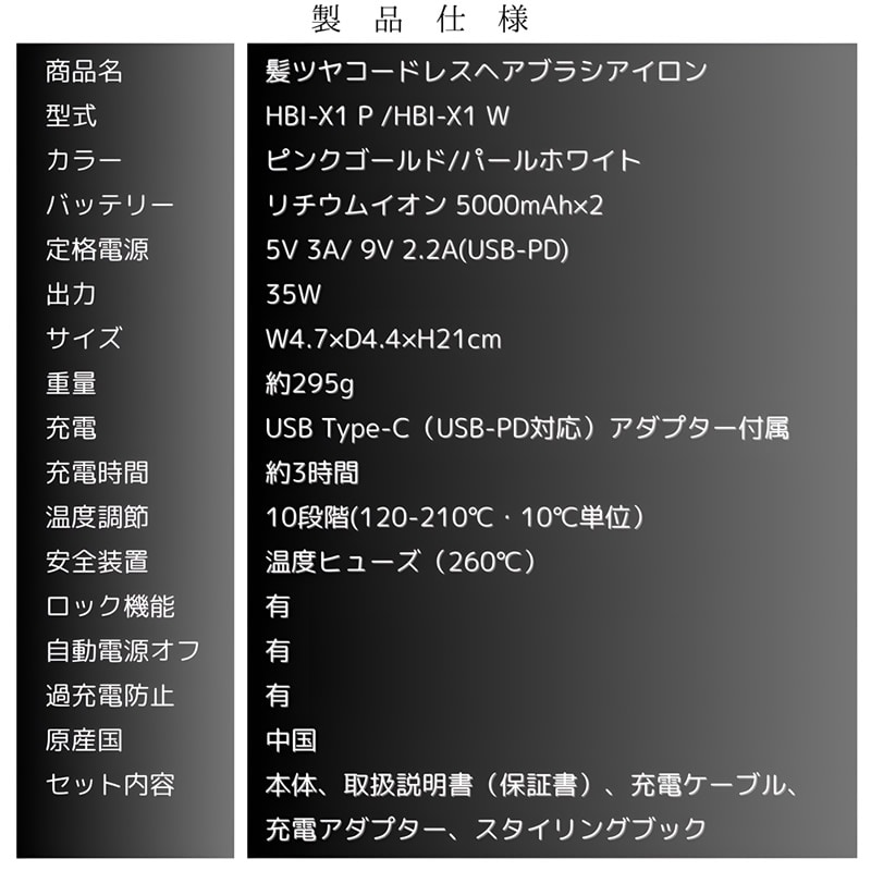温度設定 120℃〜210℃(10℃単位10段階) 充電 USBケーブル(typeC)
