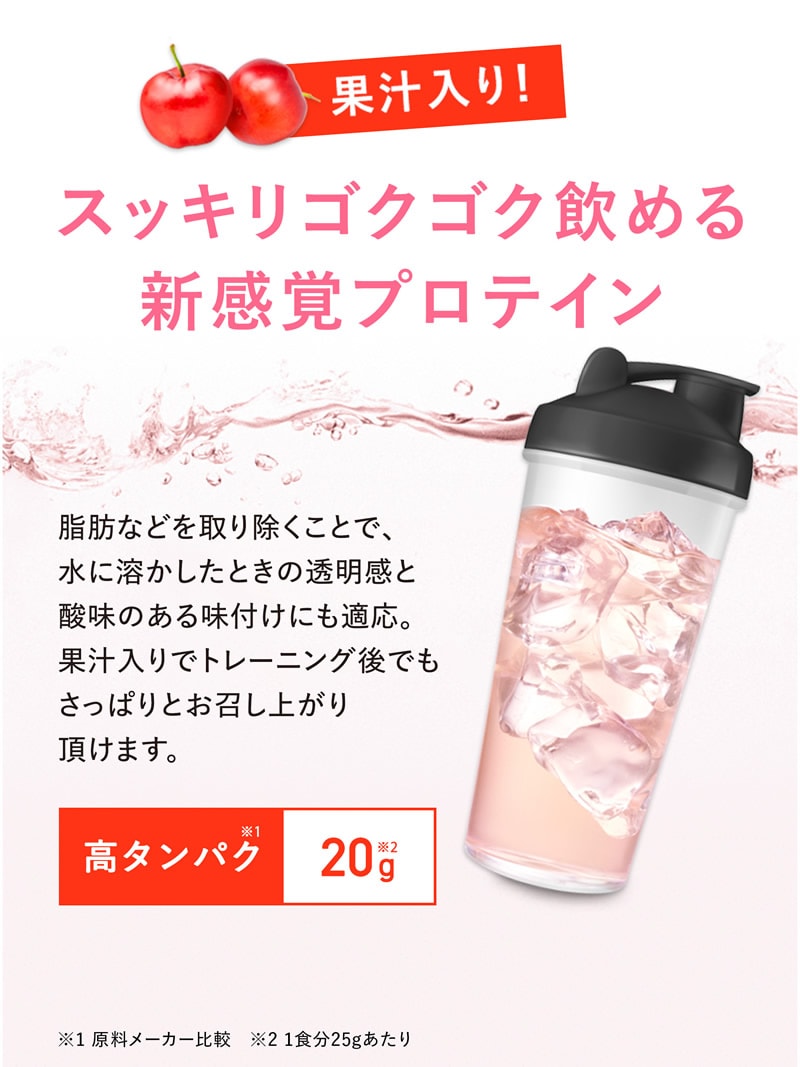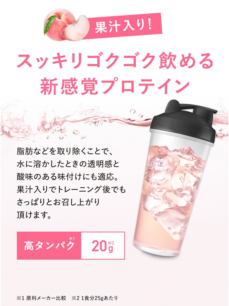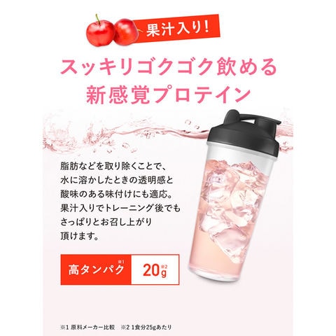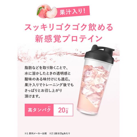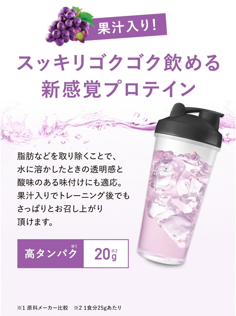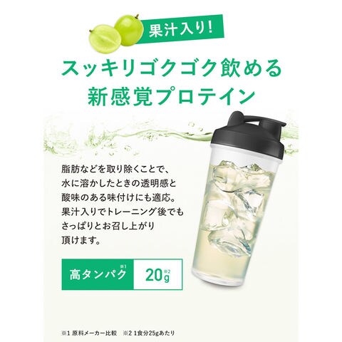 スッキリゴクゴク飲める新感覚プロテインパウダー。スッキリジューシーなアセロラ味、マスカット味、ピーチティー味、ぶどう味[約16~32回分]。