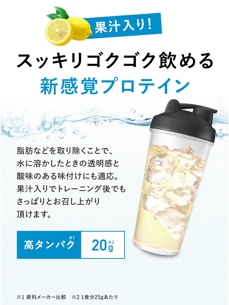 スッキリゴクゴク飲める新感覚プロテイン、塩レモン味(沖縄海塩使用)。