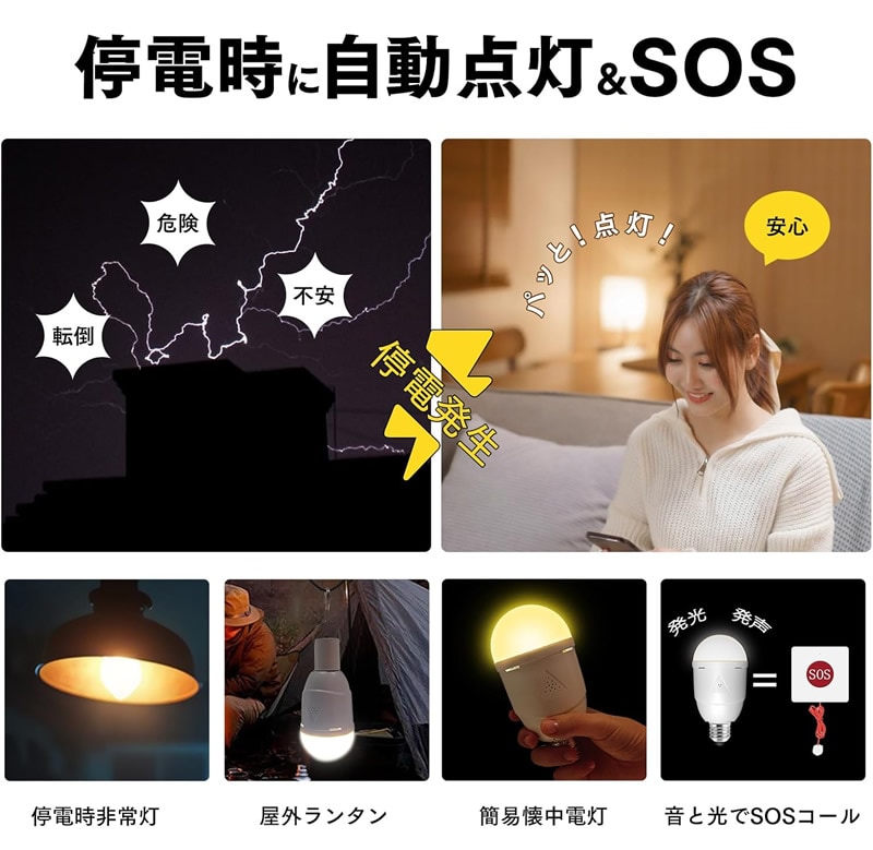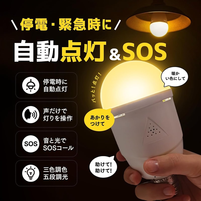 LED 電球 自動点灯 音声操作 停電 SOSコール 災害 防災 省エネ 非常灯 屋外 ランタン 懐中電灯