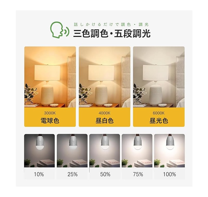三色調色 昼光色、昼白色、電球色(6000K-3000K)