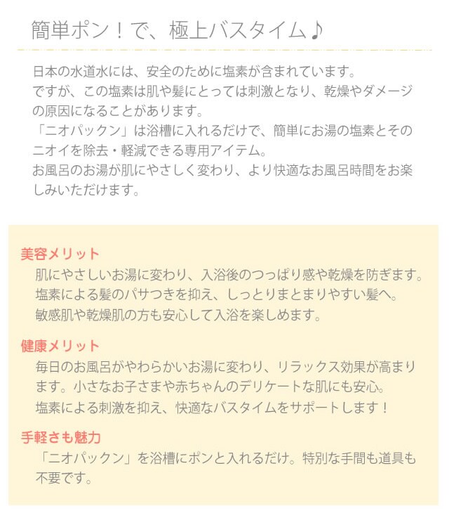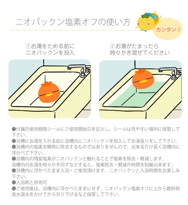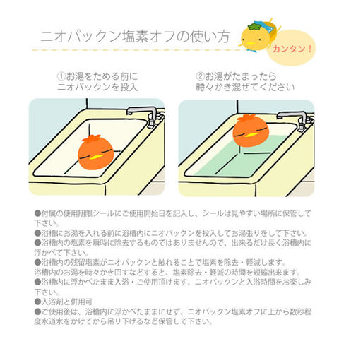 ●浴槽内の残留塩素がニオパックンと触れる事で塩素を除去。また、浴槽内のお湯を定期的にかき回すなど行って頂く事で、塩素除去・軽減の時間を短縮出来ます。