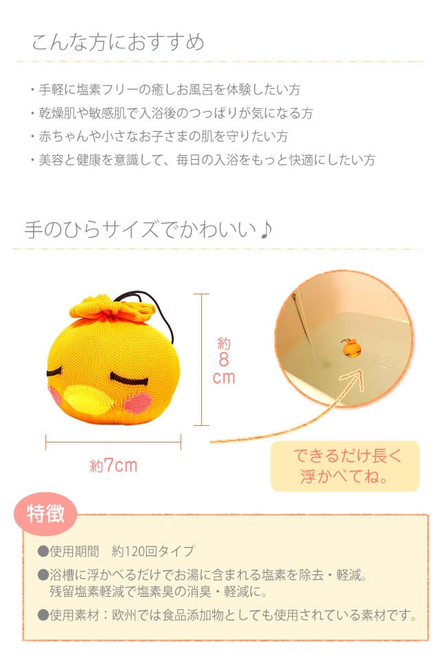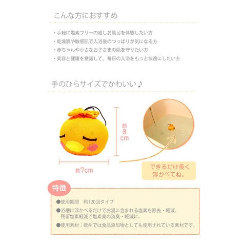 ●浴槽に浮かべるだけでお湯に含まれる塩素を除去・軽減。残留塩素軽減で塩素臭の消臭・軽減に。