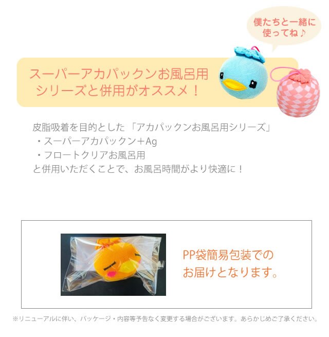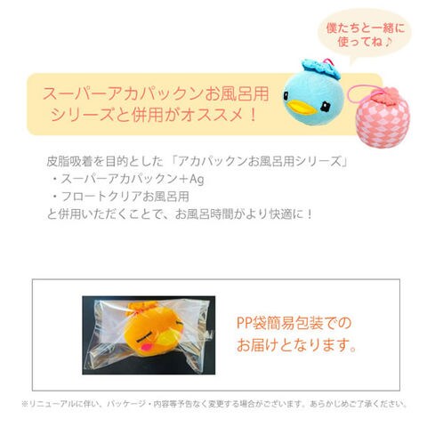 ※皮膚吸着を目的としておりませんので、アカパックンお風呂用シリーズと併用頂く事でより快適なお風呂時間を楽しめます。