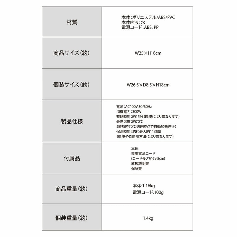 最高温度 約70℃(蓄熱時70℃到達時点で自動加熱停止)