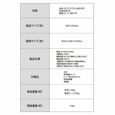 保温時間目安 最大約11時間(室温25℃であんかとして布団などでくるんで仕様した場合/環境やご使用方法により異なります)