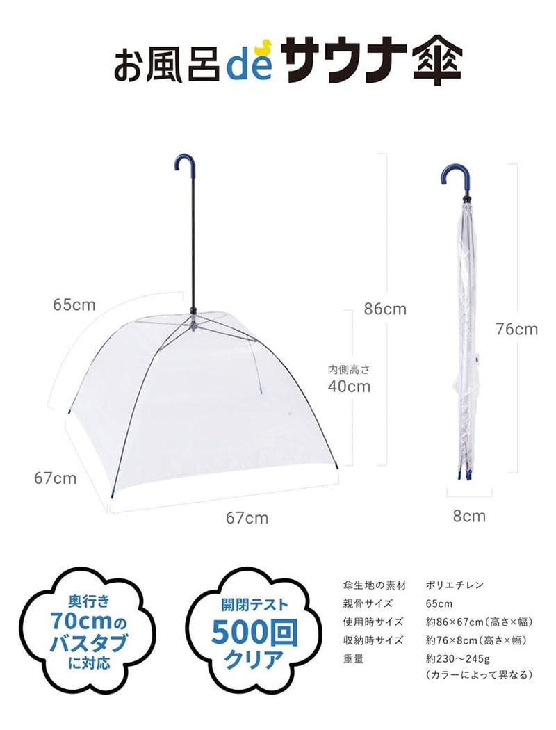 お風呂deサウナ傘(R)は、ご自宅のお風呂で手軽に温かいプライベート空間をつくる、新しい入浴アイテムです。