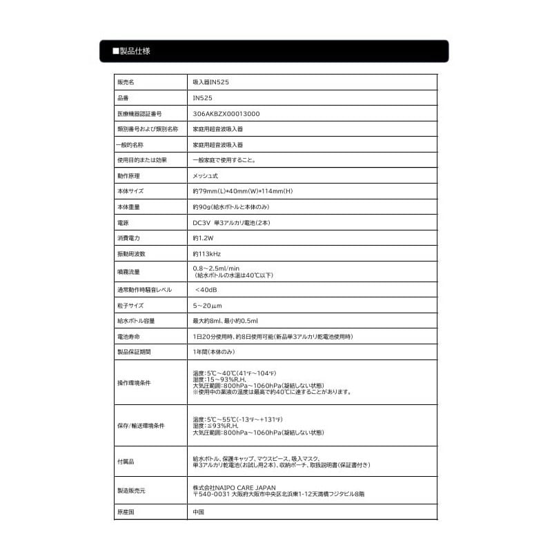 本体、給水ボトル+保護キャップ、吸入マスク、マウスピース、収納ポーチ、単三アルカリ乾電池(お試し用2本)、取扱説明書(保証書付)