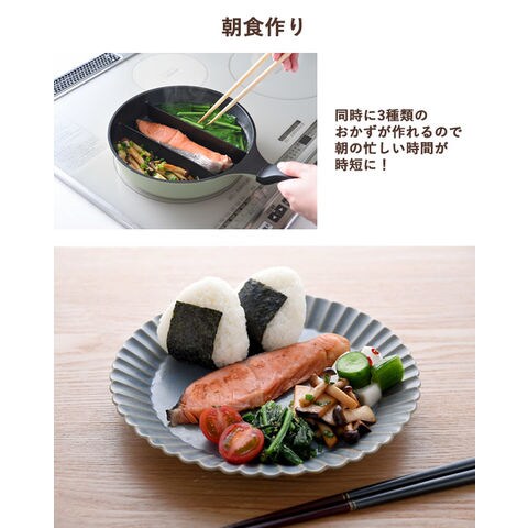 3つの仕切りで同時に調理できるフライパンです。