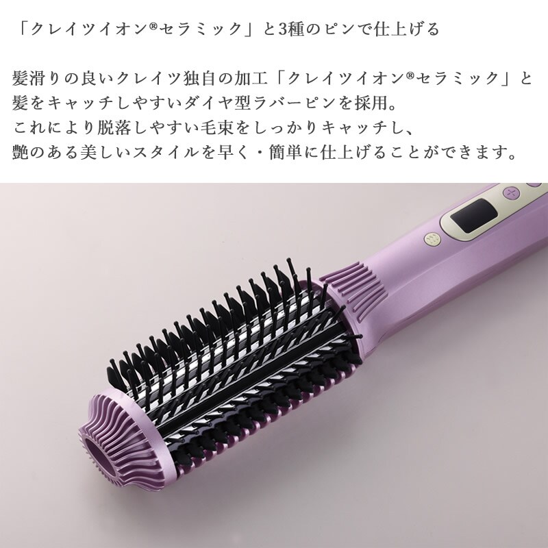 パッド表面には髪滑りが良い「クレイツイオンセラミック」加工。適度な間隔で配置されたナイロンピンで操作性や髪通りを良くします。