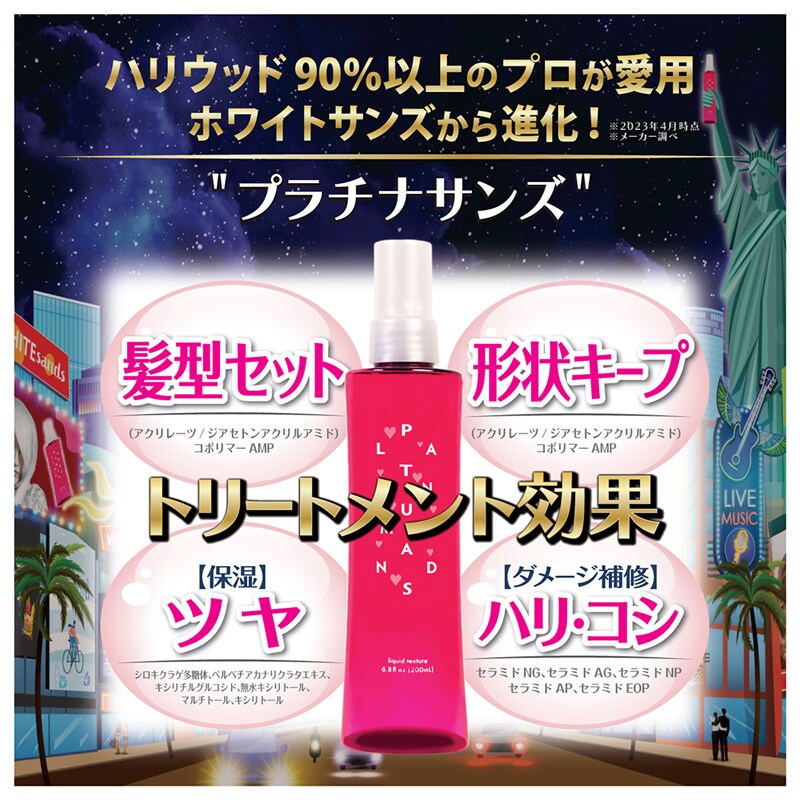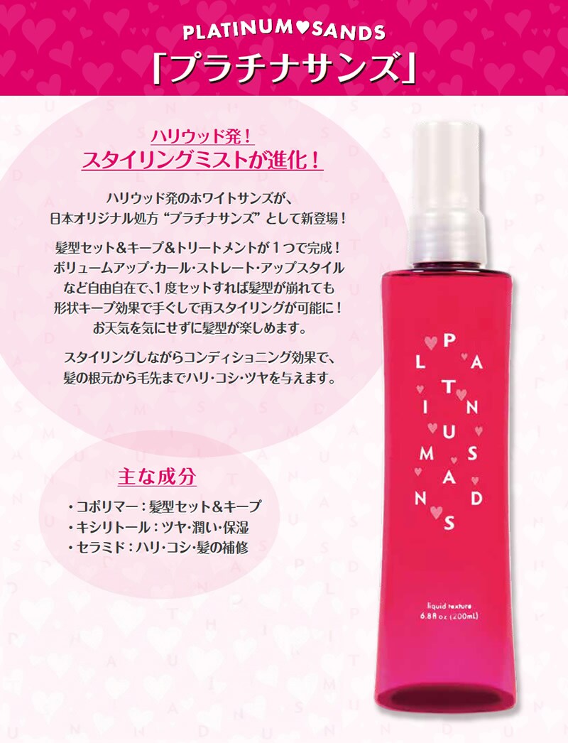 プラチナサンズ ヘアケア スタイリング剤 ミスト ダメージ 補修 トリートメント ボリュームアップ ストレート クセ毛 アップスタイル セット キープ ハリ コシ 髪型 PLATINUM SANDS