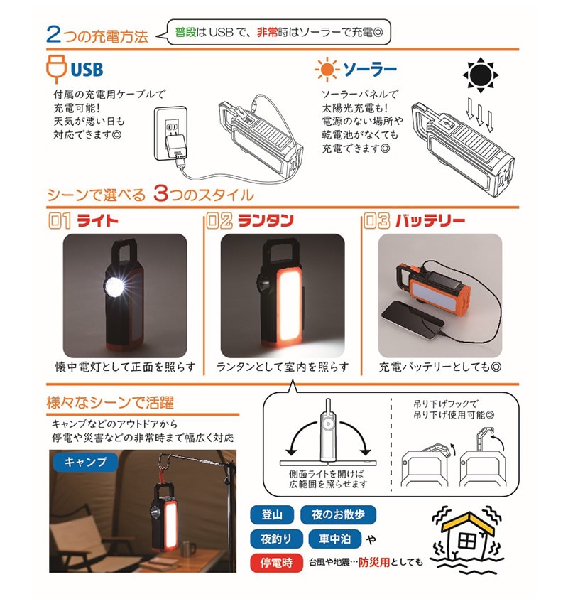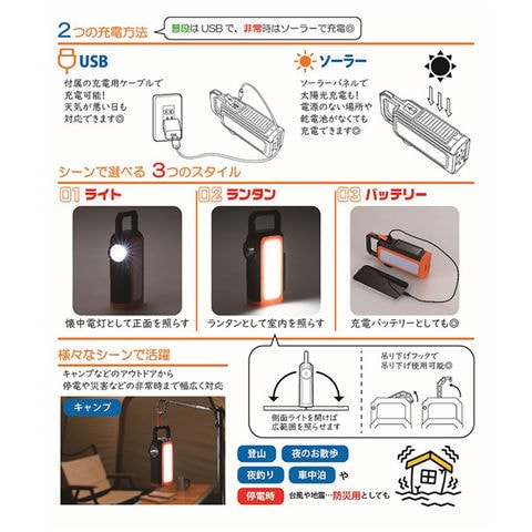 懐中電灯 ランタン バッテリー アウトドア 災害 防災グッズ 非常時 電源 ソーラー USB 充電 置き型 吊り下げ 携帯 軽量 持ち運び