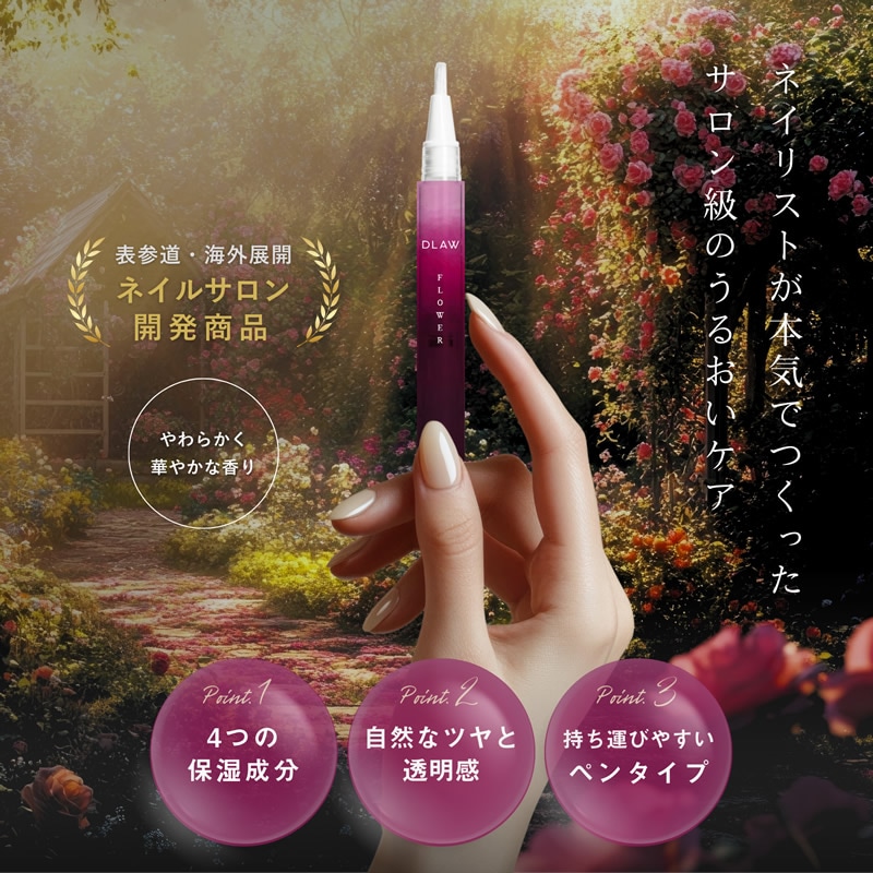 ドロウ(DLAW)が、ネイルケア商品で(爪用美容液)でネイル(爪)を保湿ために開発したトップネイリスト監修のネイルオイルです。