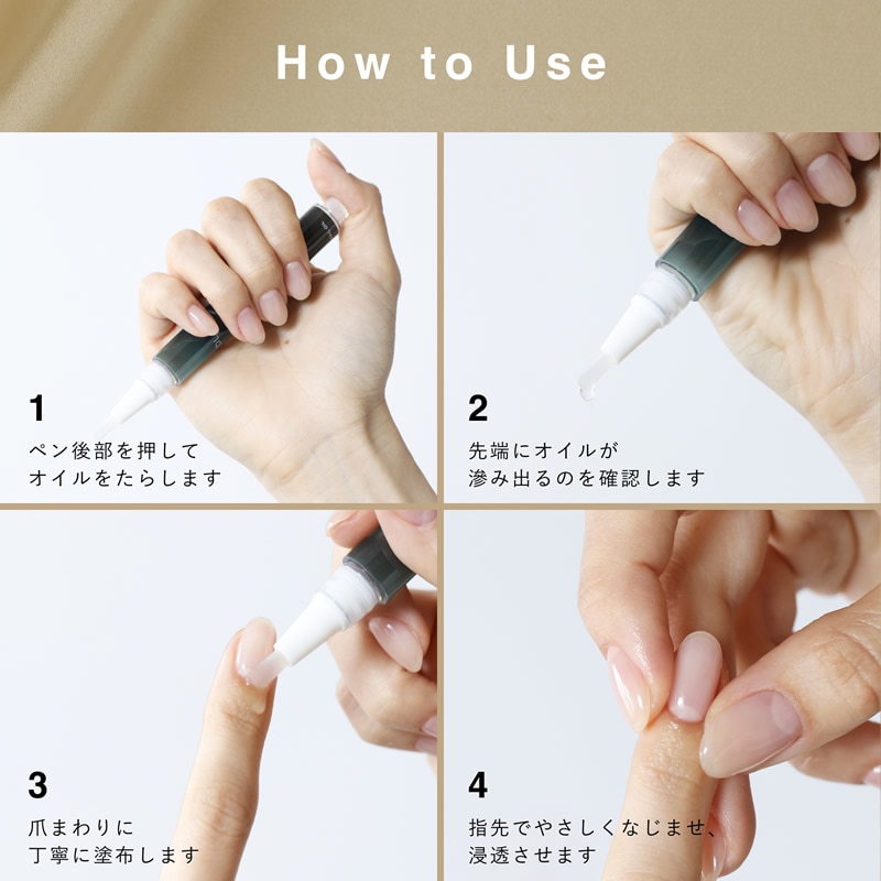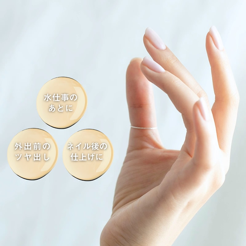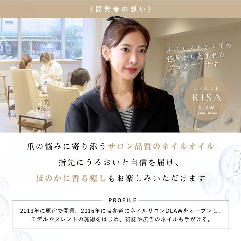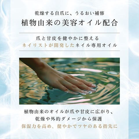 このネイルオイルは主に植物由来の保湿成分とビタミンEを配合し、爪(ハイポニキウム)と甘皮を乾燥から守りながら保湿し、指先をしっとり整えるネイルサロン発のキューティクルケアアイテムです。