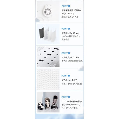 モバイルバッテリー式でベビーカー・チャイルドシートにぴったり。お出かけ先でも安心。