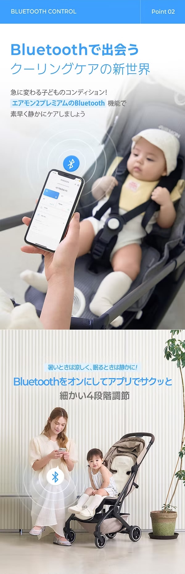 専用アプリで風量やモードをスマホから遠隔操作。Bluetooth搭載で、育児をもっとスマートに。