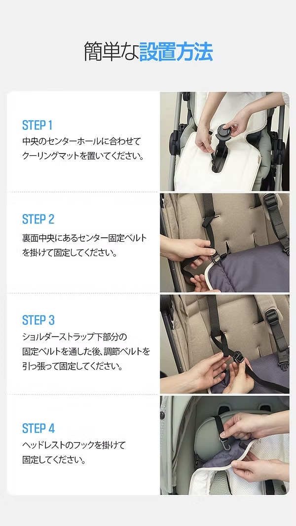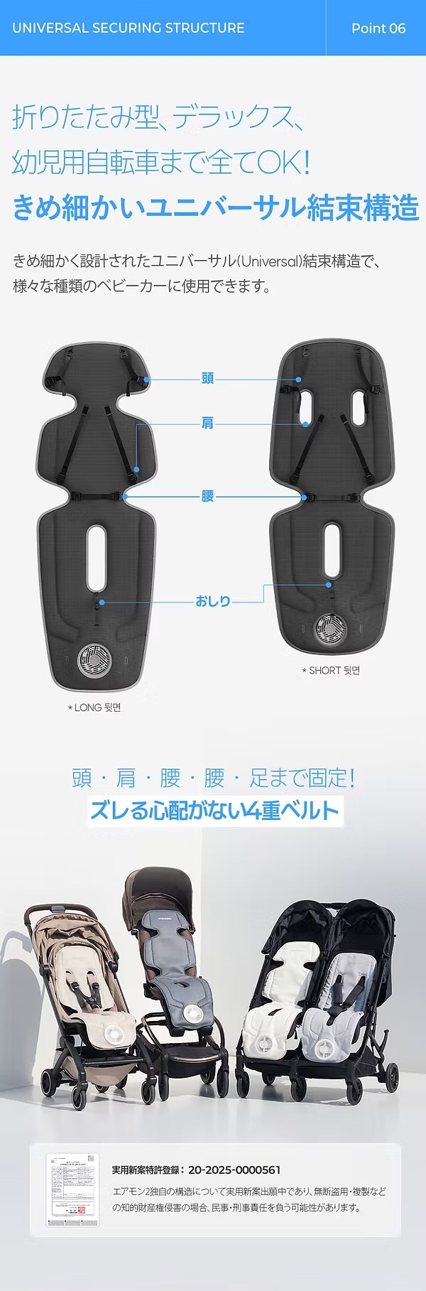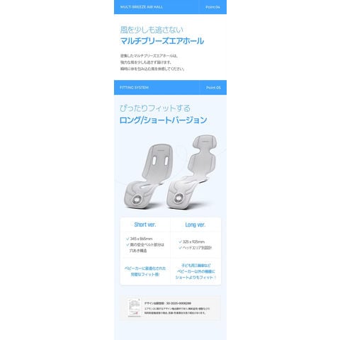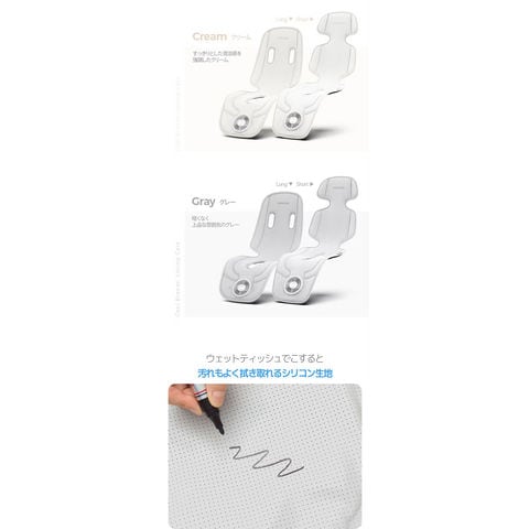 ロング・ショートの2サイズ展開。4点固定ベルトでズレにくく、チャイルドシートにも対応。
