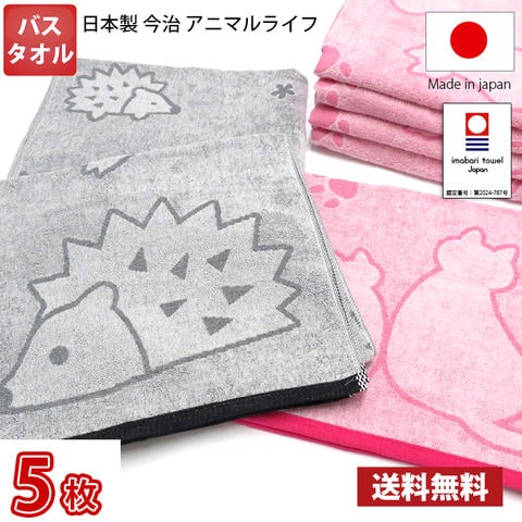 【送料無料】同色5枚セット 日本製 今治タオル アニマルライフ バスタオル 600匁 薄手 / 今治 タオル バス 国産 ネコ ハリネズミ