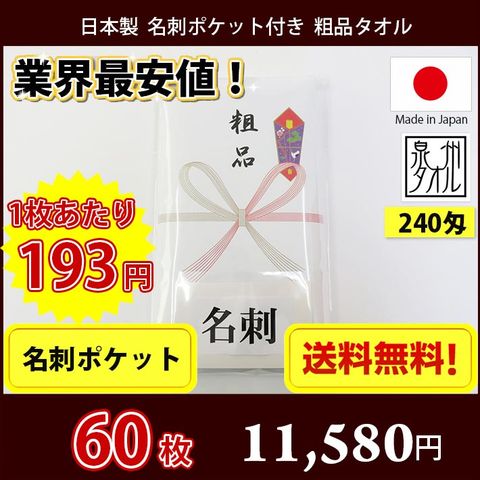 【送料無料】60枚セット 粗品タオル 【名刺ポケット付きビニール】 日本製 泉州タオル 240匁 白 フェイスタオル