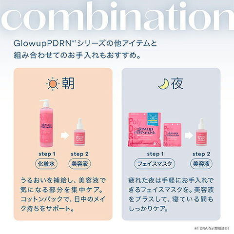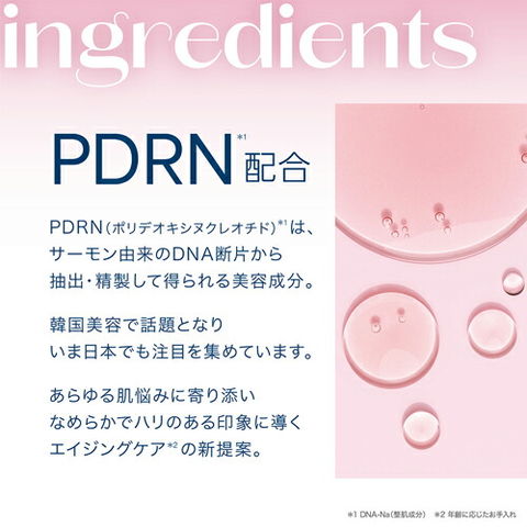 【商品説明】サーモン由来の「PDRN(ポリデオキシリボヌクレオチド)」を主成分に配合した美容液。ヒアルロン酸、ナイアシンアミド、レチノールなども配合し、みずみずしくなめらかな肌へ導く処方です。必要な部分に使いやすいフォーミュラで、朝晩のスキンケアに加えるのに適しています。