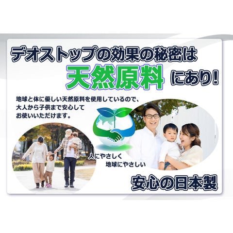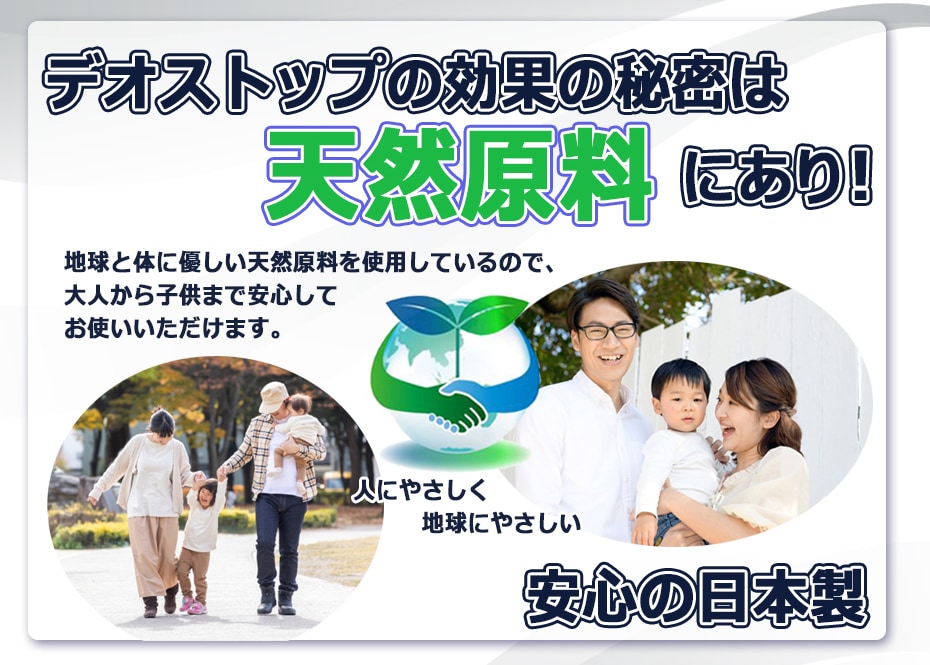 デオストップはニオイを吸収するのではなく、バクテリアの発生・繁殖を徹底的に抑止し除菌・抗菌化します。天然由来成分で安心の日本製!振りかけるだけなので手間いらずです。