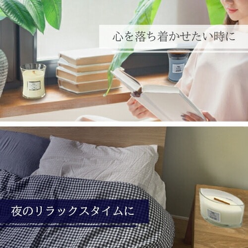繊細な調香とエッセンシャルオイルを配合した高品質なブレンドワックス作られたキャンドルは、洗練された香りと木製芯によるパチパチ音が特徴です。