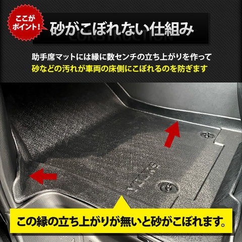 ・フロアをスキャンして製作しているのでピッタリフィット! ・マットの一部には付属のマジックテープで車体と固定するのでマットは全くズレません! ■純正マットの端から落ちるゴミや砂をガッチリガード!! ・隙間なくフィットするので、ゴミや砂が直接車両床に落ちることはありません。 ・3Dデザインなので縁の数センチの立ち上がりで水や汚れをしっかりキャッチ! ■完全防水なのでお手入れも簡単! ・水や汚れは軽いものならウエスなどで拭くだけでOK! ・全面的に汚れた場合は丸洗いも可能なので衛生的です。 ■新素材の熱可塑性エラストマー(TPE)を使用。 ・弾力があり、曲げたりすることも可能なので、お車からの取り外しも容易です。 ・ゴムのように車内が臭くなりません。 ・耐久性抜群なので何十万キロ走っても大丈夫です。 |
