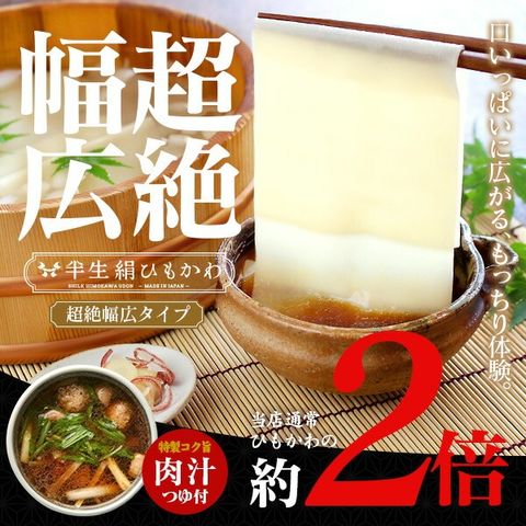 通常のひもかわでも広いのにさらに幅広!通常幅5cmがなんと2倍の10cm!ご当地でも人気の「超幅広タイプ」をたっぷり堪能!