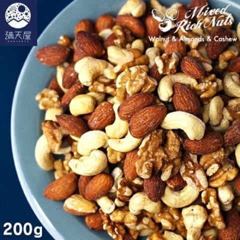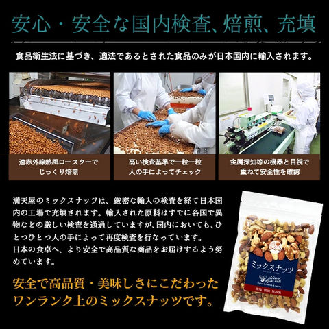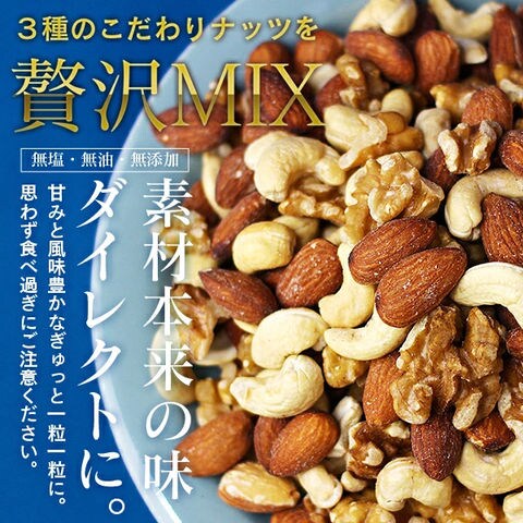 良質良粒、産地と素材にこだわった、くるみ ( 生 )、アーモンド ( ロースト )、カシューナッツ ( ロースト ) を贅沢ミックス。無塩、油不使用で素材本来の味をお楽しみ頂ける ミックスナッツ です。