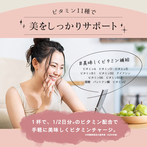 ビタミンA、ビタミンD、ビタミンE、ビタミンB1、ビタミンB2、ナイアシン、ビタミンB6、ビタミンB12、葉酸、パントテン酸、ビタミンC と美容、健康に欠かせないビタミン11種類を1/2日分配合(※栄養素等表示基準値(2020年版))。