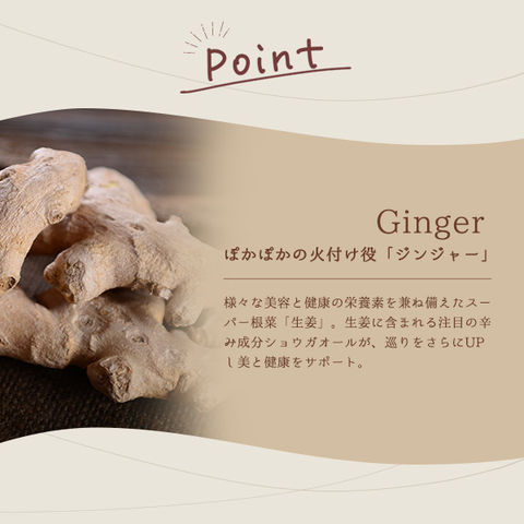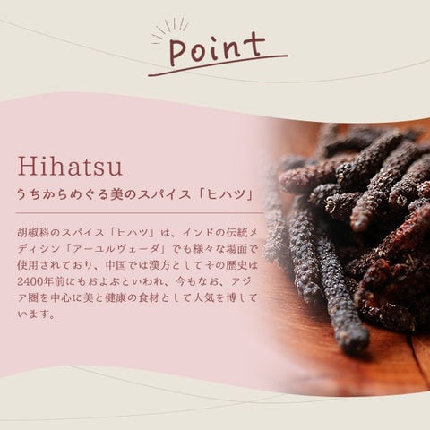 めぐりのスパイス、ジンジャーとヒハツを配合!スッキリとした味わいで、美容と健康ケアをサポートします。