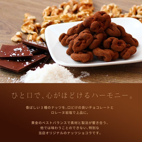 香ばしい3種のナッツを、口どけの良いチョコレートとロレーヌ岩塩で上品に。