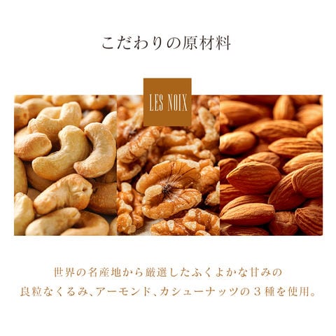 世界の名産地から厳選したふくよかな甘みの良粒なくるみ、アーモンド、カシューナッツの3種を使用。
