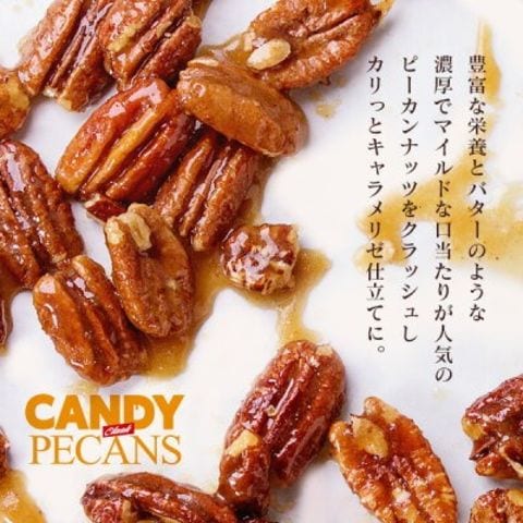 クラッシュタイプのピーカンナッツを香ばしくキャンディコーティング♪ナッツのコクと程よい渋みに甘みがプラスされ、サクッとした食感で、ついつい手が伸びる美味しさです!
