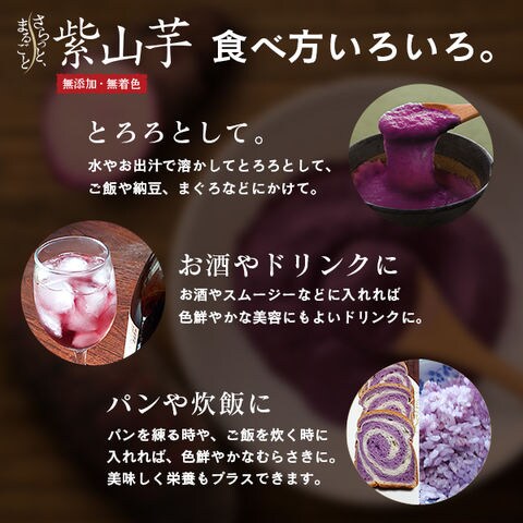 貴重な食材として昔から珍重されてきた紫山芋のポリフェノール、サポニンなど豊富な栄養をさらっと手軽に。 素材の自然な美味しさそのままに、無添加、無着色、保存料を一切使用しておりません。