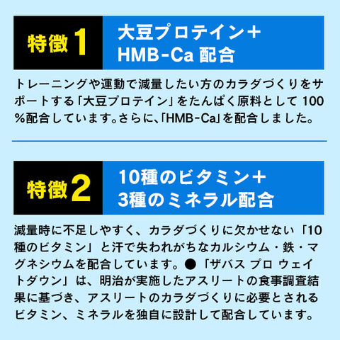 「ザバス プロ ウェイトダウン」は、明治が実施したアスリートの食事調査結果に基づき、アスリートのカラダづくりに必要とされるビタミン、ミネラルを独自に設計して配合しています。