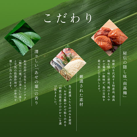 紀州沿岸に自生するダンチク(暖竹)の葉。その清々しい香りと天然の殺菌作用が、お寿司を優しく包み込みます。