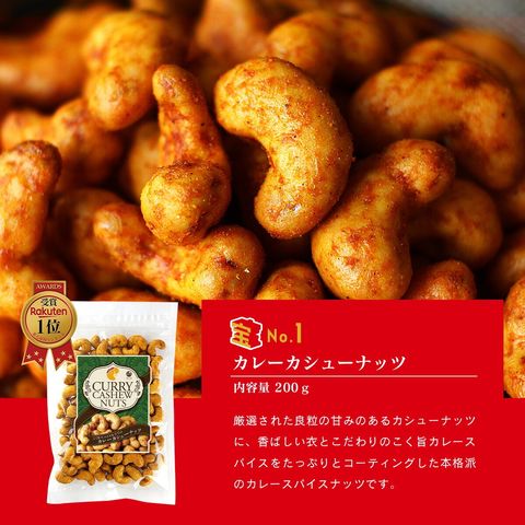 厳選された良粒の甘みのあるカシューナッツに、香ばしい衣とこだわりのこく旨カレースパイスをたっぷりとコーティングした本格派のカレースパイスナッツです。