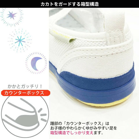 踵部の「カウンターボックス」はお子様のやわらかくゆがみやすい足を箱型構造でしっかり支えます。