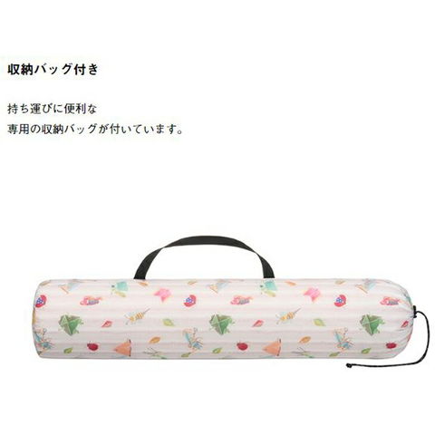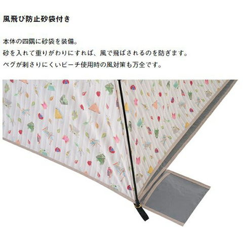 四隅には風飛び防止の砂袋が付いていて、砂を入れて重りがわりにすれば、風で飛ばされるのを防ぎます。