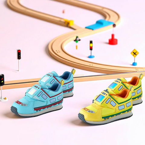 甲部分の道路標識や線路など靴全体で電車を表現した
