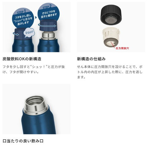 炭酸飲料OK!フタを少し回すと中の圧力が逃げる新構造のフタを採用。